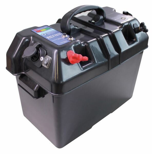 Akkulaatikko jossa +/- ulosotot siipimutterikiinnityksellä. Lisäksi kolme erillistä suojahatulla varustettua virran ulosottoa, joista yksi on perinteinen tupakansytytinpistorasia ja 2 kpl kaksiosaisia USB-liitäntöjä (1A + 2A)