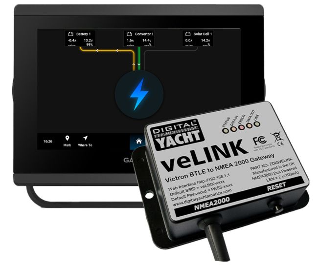 veLink yhdistää jopa kahdeksan Victron-laitetta Bluetoothin kautta ja keskittää niiden tärkeimmät tiedot NMEA2000-verkkoon. Se mahdollistaa akun tilan, aurinkopaneelien tulojen, tasavirtamuuntimien ja ranta-/generaattorin latauksen valvonnan ja yhdistää hälytykset yksinkertaista valvontaa varten laitteen monitoiminäytöistä.