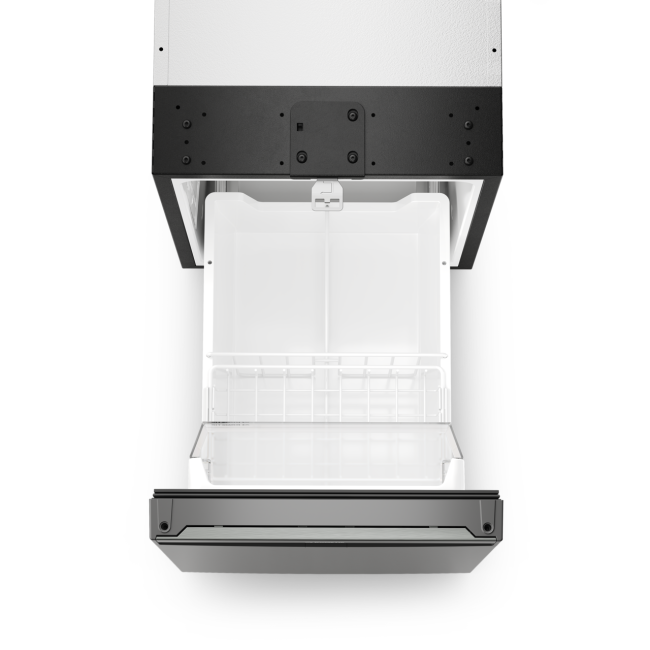 Tämä elegantti vetolaatikkojääkaappi tarjoaa kätevän ulosvedettävän pääsyn tarvikkeisiisi. Sen modulaarisuus mahdollistaa erilaiset säilytysyhdistelmät. Patentoitu pakastinosasto on helppo irrottaa, mikä tekee enemmän tilaa pystyasennossa oleville pulloille ja juomille. Uusi elektronisesti ohjattu kompressori ja puhaltimen nopeus takaavat hiljaisen käytön ja taloudellisen virrankulutuksen