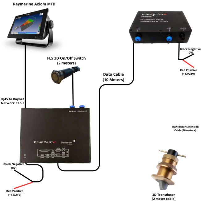 FLS 3D – 30° integroituu suoraan Raymarine Axiom -näyttöihin ja voidaan liittää Raynet-verkkoon RJ45–Raynet-kaapelilla. Kun laite on yhdistetty, Axiom-näytölle ilmestyy EchoPilot-sovellus, jonka kautta Forward looking -kaikuluotaimen kuva näkyy reaaliajassa. Näyttö mahdollistaa sekä merikartan että eteenpäin näyttävän kaikuluotaimen samanaikaisen tarkastelun tai näiden jakamisen rinnakkaisnäkymään käyttömukavuuden maksimoimiseksi. Axiom-näytön kautta käyttäjä voi myös kääntää 3D-kuvaa 360 astetta kosketuksella sekä zoomata näkymää. Näin edessä oleva merenpohjan muoto ja mahdolliset esteet näkyvät entistä tarkemmin reaaliajassa.