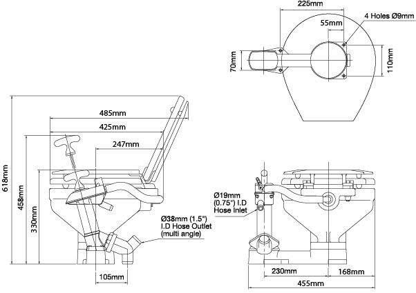 Luotettava ja kestävä käymälä, jossa on Twist ’n’ Lock -pumpputoiminto, joka lukitsee poistoventtiilin, kun kahvaa käännetään 90°. Tämä estää poistoveden painumisen takaisin kulhoon. (Jos asennus tapahtuu vedenpinnan alapuolelle tai säiliö on sijoitettu yläpuolelle, tarvitaan vesilukko, jossa on tuuletettu silmukka pumpun ja kulhon välillä.) Pumppu voidaan asentaa kulhon oikealle tai vasemmalle puolelle.