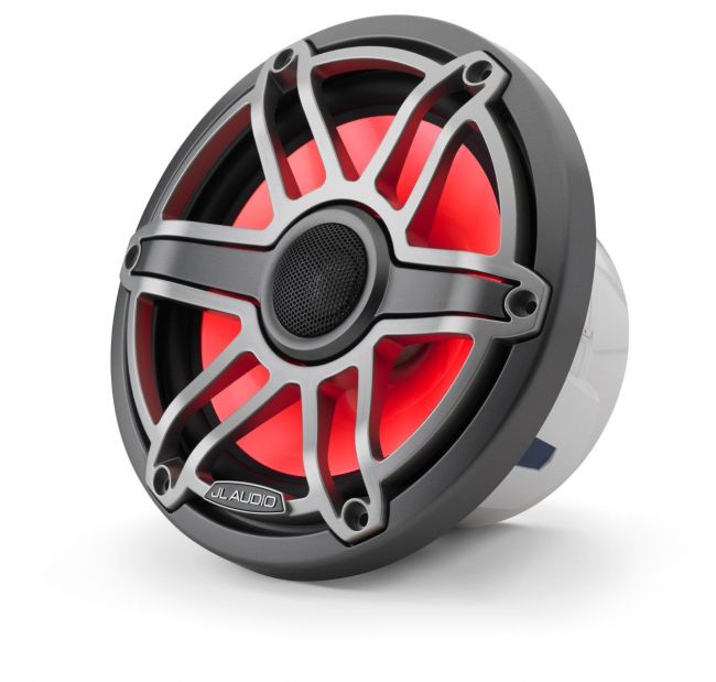 JL Audio 7.7" M6-770x kaiutinpari titaaninvärisellä Sport-ritilällä ja aseharmaalla rungolla sekä LED-valaistuksella