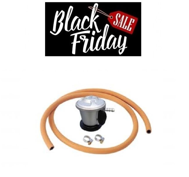 Setti sisältää paineensäätimen vaatimusten mukaisille kaasupulloille, 1,2 m pituisen kaasuletkun sekä 2 kpl letkunkiristimiä