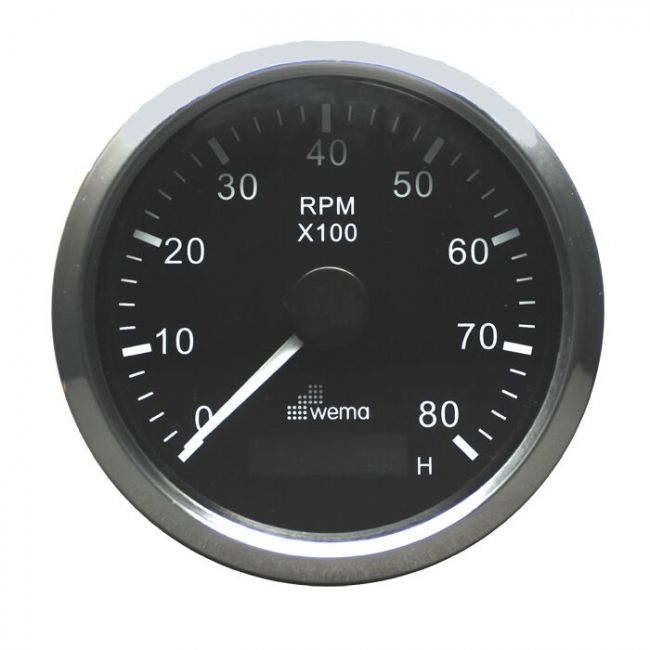 Kierroslukumittari 0-8000 RPM näyttöalueella sekä LCD-käyttötuntimittarilla. Kytketään laturin W-napaan. Asennus- Ø 85 mm, asennussyvyys 55 mm Vakiona punainen ja keltainen valaistus. Käyttöjännite 12 tai 24 V. Musta pohja, kehys ruostumatonta terästä.