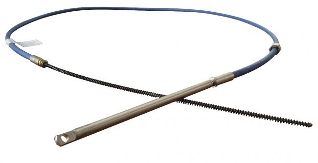 M90 MACH (sinisellä kuorella) on korkealaatuinen ja kestävä ohjauskaapeli, joka soveltuu vaativiin ohjausratkaisuihin. Uudistetut ohjauskaapelipäät ja ohjauspesän puolella patentoitu kiinnitys, joka sopii useampiin ohjauspesiin (kuva B). Moottoripuolen kaapelipäässä kumitiiviste estää vedenpääsyn kaapeliin (kuva A). Min. taivutussäde 150 mm. Pituus 6,0 m.