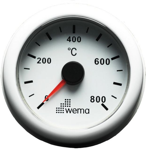 Pakokaasulämpötilamittari 0 - 800°. Asennus-Ø 52 mm, asennussyvyys 55 mm. Kokonais-Ø 62 mm.