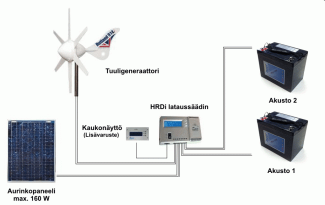 - 1 x Rutland 914i tai FM910-4 Furlmatic tai Rutland 504 Windcharger sekä 160 W aurinkopaneelitehoa. Kytkentä yhteen akustoon.
