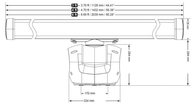 - Avoantennin leveys 2039 mm, syvyys 185 mm, korkeus 135 mm, pedestaalin kanssa korkeus 429 mm