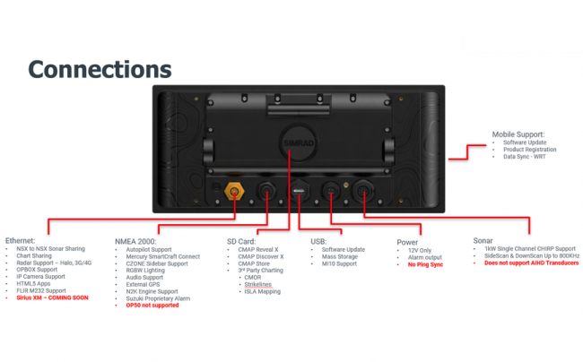 - Kaikuluotaimien yhteensopivuus - Yksi 9-nastainen Xsonic 1 kW Sonar -portti. Yksikanavainen CHIRP, 50/200 KHz, SideScan & DownScan enintään 800 KHz, verkkokaikuluotaimen moduulit S3100, S5100.