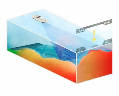 - Antaa syvyystiedot veneen edestä mahdollistaen navigoinnin matalammissa vesissä ja huonommin kartoitetuilla alueilla