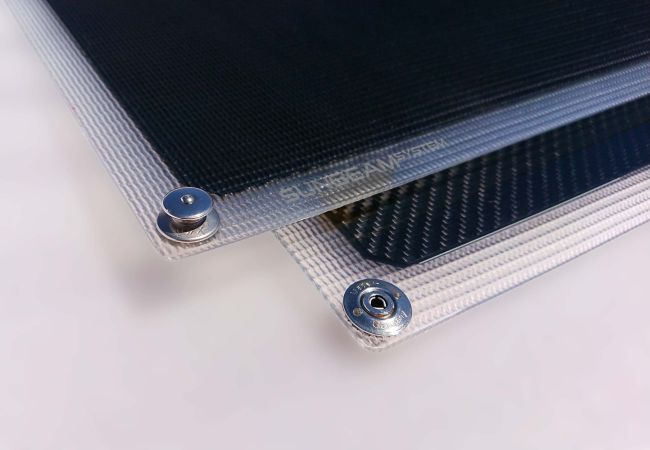 Jokaisen paneelin ytimessä on jäykkä hiilikuituinen sandwich-ydin, joka tarjoaa tarvittavan vakauden aurinkokennojen suojaamiseksi pohjimmiltaan pehmeällä pinnalla. Hiilikomposiittirakenne pitää painon erittäin alhaisena, mikä on ratkaisevan tärkeää, jotta kangas ei painu alas tai vääristy.