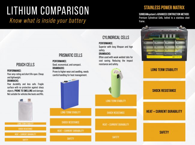 Päinvastoin kuin muut Lithium-akkuratkaisut SUNBEAMsystem SMART LITHIUM akku on täysin yhteensopiva vanhan lyijyakkujärjestelmän akkujen tilalle, ilman tarvetta erillisille releille tai järjestelmän uudelleenrakentamiselle. Voit halutessasi jopa säilyttää lyijyakkuja järjestelmässä. Useita SMART LITHIUM akkuja voidaan asentaa rinnan eikä nykyistä maasähkölaturia tai moottorin laturia tarvitse vaihtaa tai modifioida. Tämän vuoksi kyseessä on todellinen Plug-and-Play akusto!