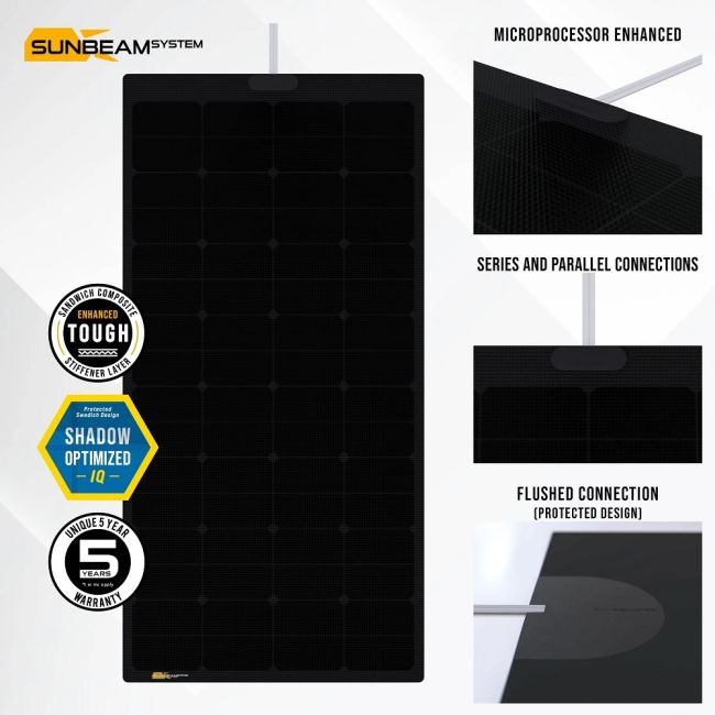 Esittelyssä SUNBEAMsystem Shadow Optimized-IQ – vallankumouksellinen edistysaskel merikäyttöön tarkoitetussa aurinkoteknologiassa. Kyseessä on maailman ensimmäinen ohut ja taipuisa aurinkopaneeli, jossa yhdistyvät täysin upotettu, näkymätön kaapelin ulostulo sekä integroitu mikroprosessori – tekninen saavutus, jota ei ole aiemmin toteutettu.