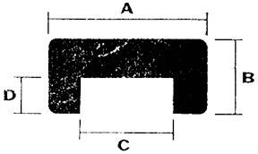 Reunalistassa U-profiili, pituus 2 metriä. Listan mitat: 13 mm, A = 22, B = 16, C = 13, D = 6,5 mm
