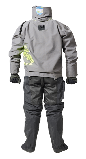 Polvi- ja takamusvahvikkeet estävät kulumista. PU-kuivaketju on sijoitettu oikealta lantiolta vasemmalle olkapäälle, mikä minimoi ketjun ergonomiset haitat istuttaessa ja liikuttaessa. Aquaseal-sepalusvetoketju vakiovarusteena. Sisäpuoliset olkaimet pitävät puvun housuosan ylhäällä samalla kun haaravyö pitää puvun takkiosan alhaalla. Teleskooppiratkaisun ansiosta housuosa ei “putoa" kuten yksiosaisissa haalareissa. Eripituiset henkilöt voivat käyttää samaa pukua ergonomisten ominaisuuksien heikentymättä. Lisäksi puvun mukana toimitetaan irrallinen neopreeninen lämpöhuppu ja käsineet, jotka suojaavat päätä ja käsiä kylmyydeltä. Puku toimitetaan kantokassissa.