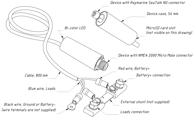 Akkumonitoria voidaan käyttää minkä tahansa yksittäisen tasavirtalähteen (esim. laturin, tuuligeneraattorin jne.) tai kuorman (vinssin, jääkaapin jne.) kanssa, mutta se on ensisijaisesti suunniteltu aluksen akun valvontaan. Toimiakseen tarkoitetulla tavalla se vaatii sopivan ulkoisen shuntin (ei toimiteta laitteen mukana); 5 A:n ja 1200 A:n shuntteja on laajalti saatavilla (katso käyttöoppaan kohta V "Shuntin valinta"). Se voidaan konfiguroida käyttämään akkuun kytketyn NMEA 2000 -lämpömittarin tietoja lataustilan ja kunnon tarkemmaksi havaitsemiseksi ja lämpötilan raportoimiseksi jännite- ja virtatietojen ohella.