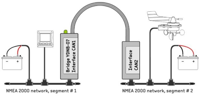 - Ohita NMEA 2000 -verkkojen fyysiset rajoitukset verkkojen pituuden (100 metriä tavalliselle kaapelille ja 250 metriä raskaalle tai keskikokoiselle kaapelille) ja verkkoon kytkettyjen fyysisten laitteiden enimmäismäärän (50) suhteen. Verkossa, jonka osoitekapasiteetti on 252, voidaan käyttää useita siltoja, jolloin fyysisten laitteiden määrä kasvaa noin 250:een.